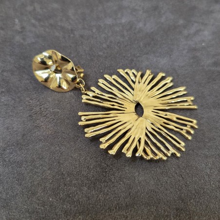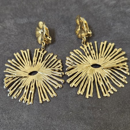Boucles d'oreilles à clips dorées au design artistique en forme de soleil éclatant, sublimé par un effet texturé et ajouré.