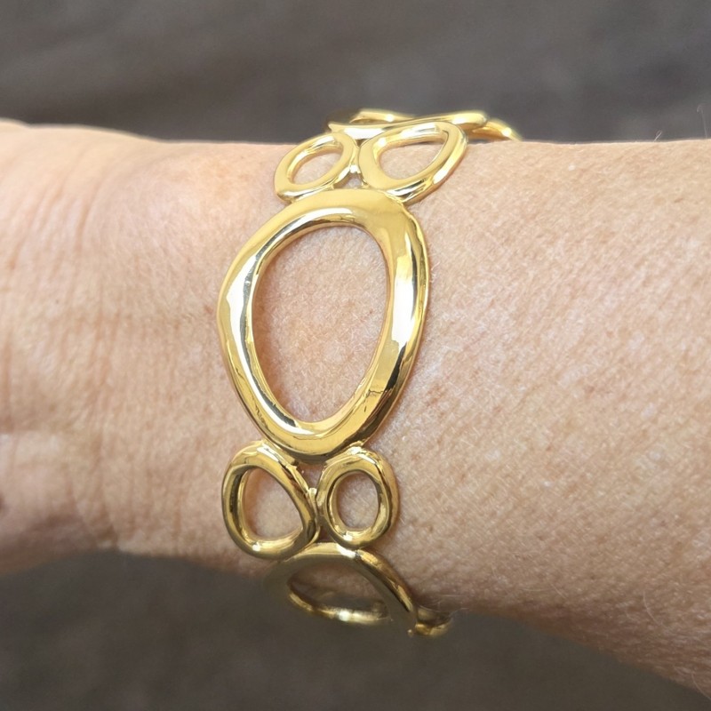 Bracelet manchette doré au design géométrique ajouré. Sa forme ovale et les découpes élégantes apportent originalité et raffinement. Conçu en métal brillant, ce bracelet est ajustable et s'adapte à votre poignet.