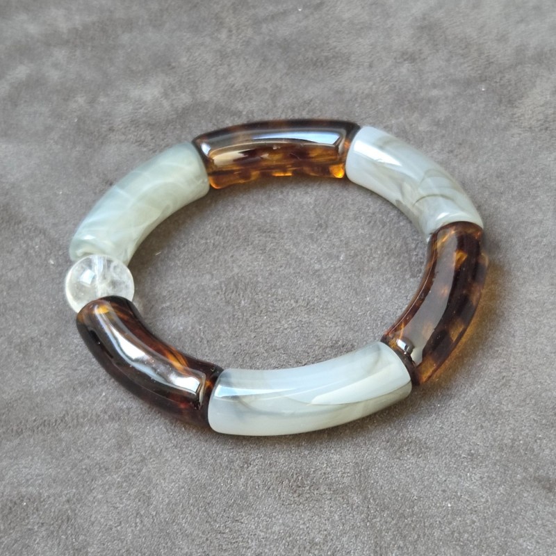 Bracelet en résine 100% acrylique, composé de "perles" rondes et cylindriques dans des couleurs grises, transparentes et léopard, montées sur élastique.