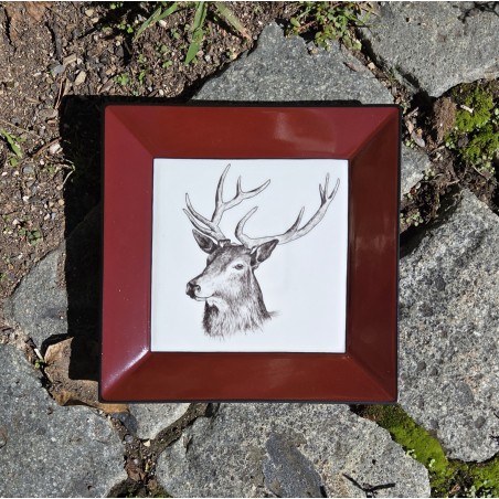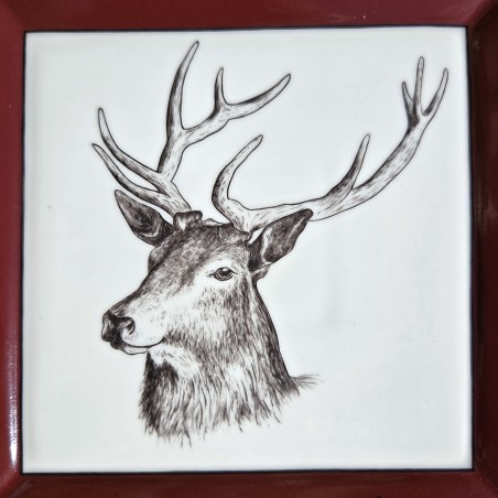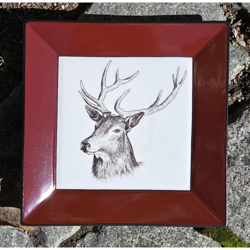 Vide-poches carré en porcelaine, décoré d'une belle tête de cerf, entouré d'un bord rouge bordeaux entouré d'un filet noir. Le vide-poches est entièrement peint à la main.