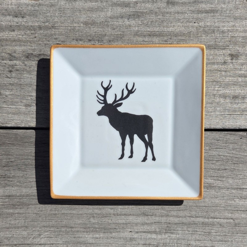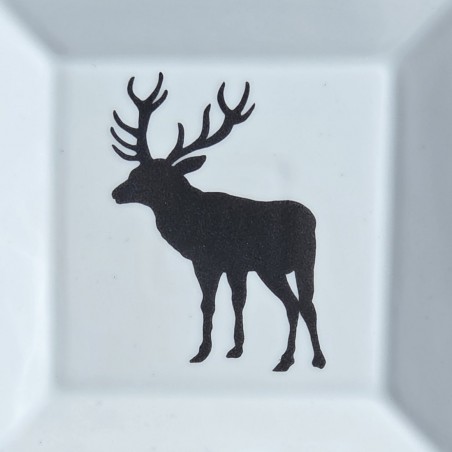 Vide-poches carré en porcelaine, sur lequel est peint à la main en noir un beau cerf. Il est entouré d'un filet également peint à la main, avec une couleur métallique cuivre.