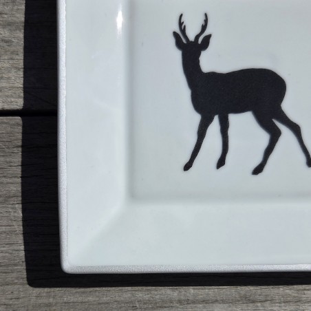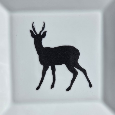 Vide-poches carré en porcelaine, sur lequel est peint à la main en noir un élégant chevreuil. Il est entouré d'un filet également peint à la main, avec une couleur métallique argentée.