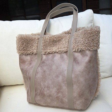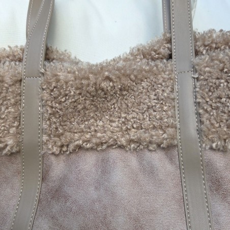Sac-cabas façon cuir gris beige, bordé et doublé de fausse fourrure bouclée dans le même ton. Ce sac super tendance est disponible en trois coloris pour s'adapter parfaitement à toutes vos tenues.