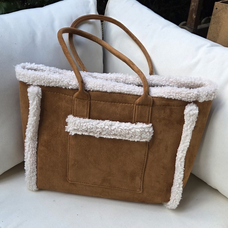 Sac-cabas très tendance façon daim camel, bordé de fausse fourrure écrue. Jolie design avec une poche extérieure et dimensions généreuses, ce sac est disponible en trois coloris pour coller parfaitement à toutes vos tenues.
